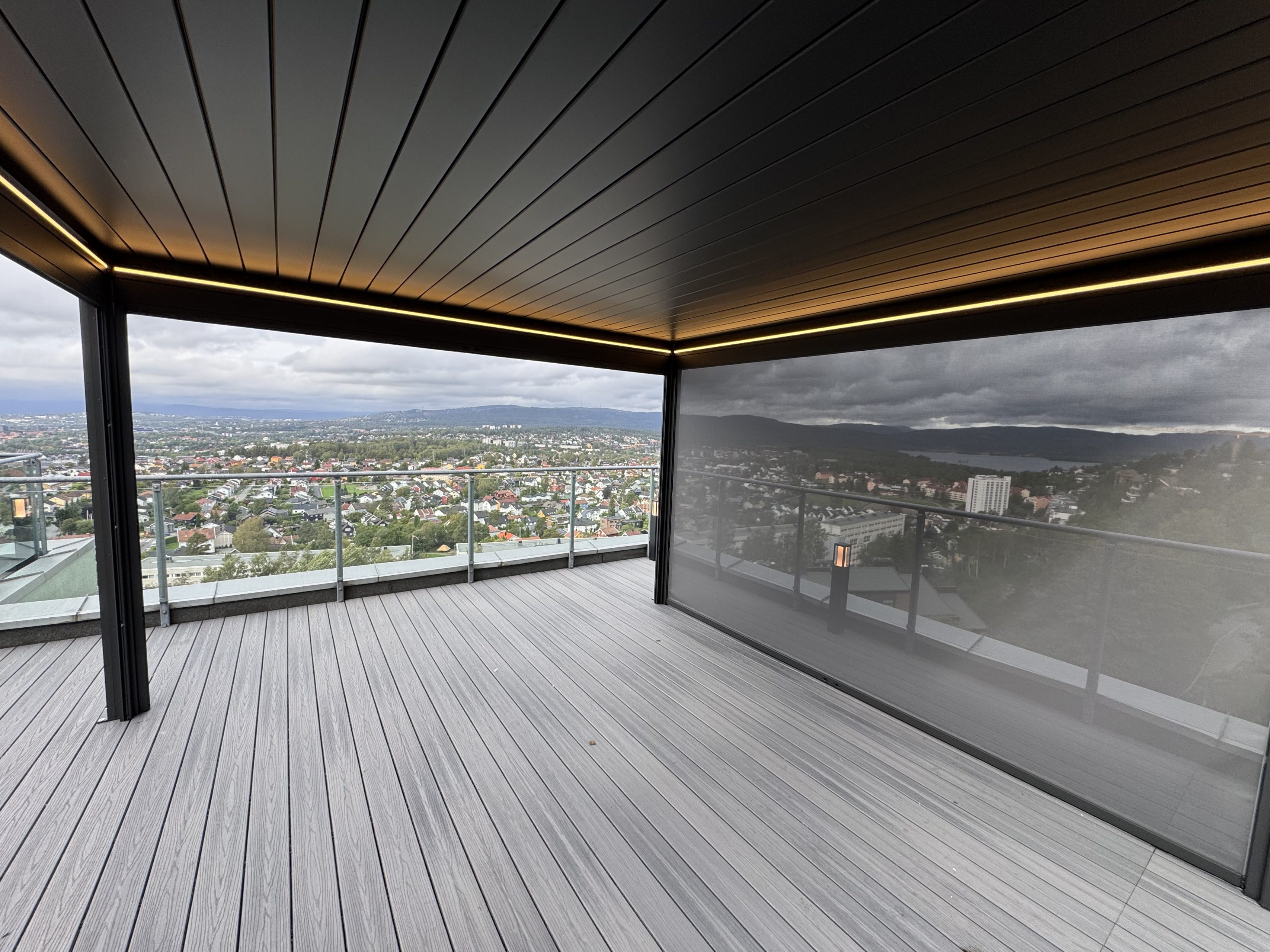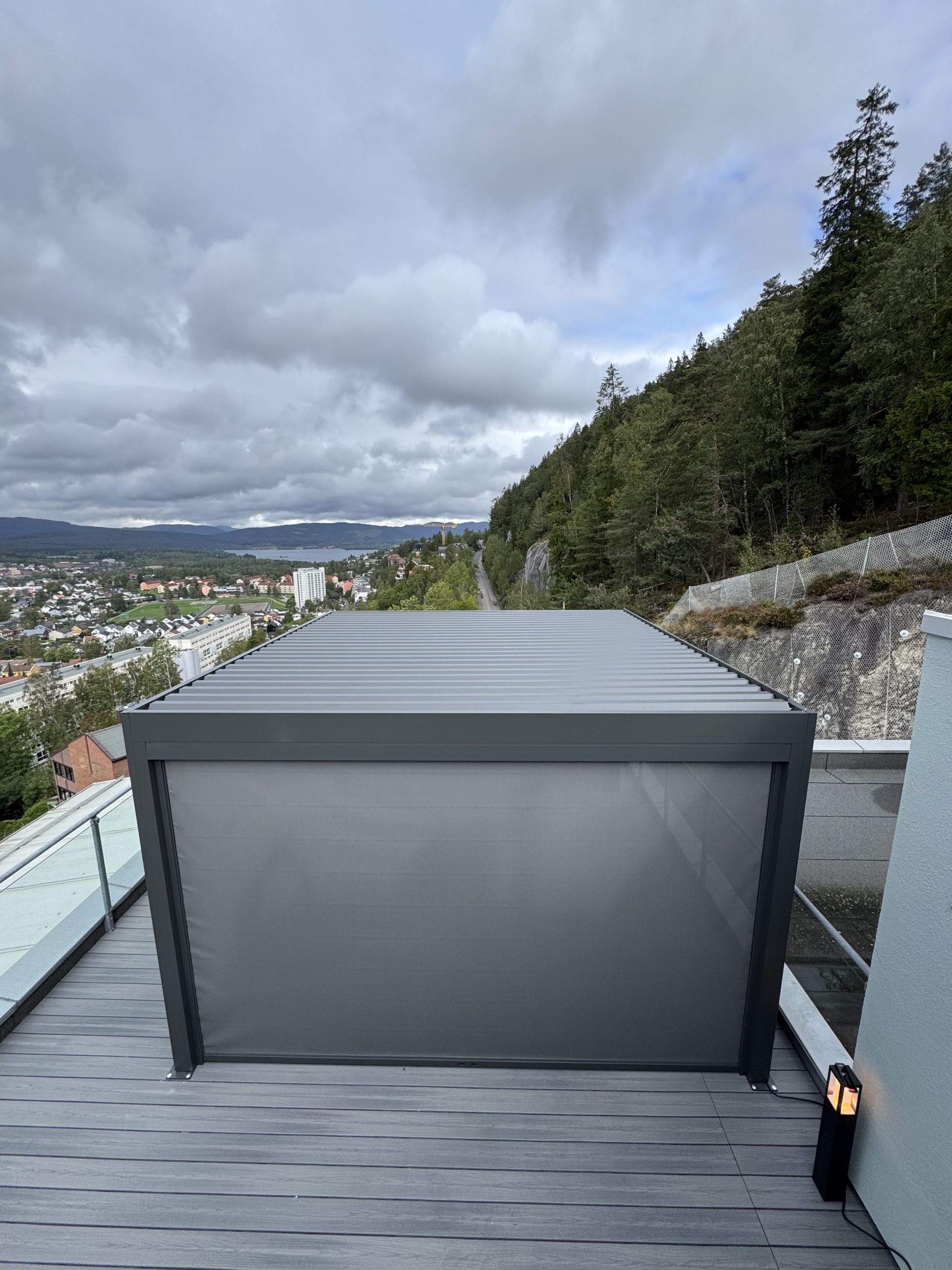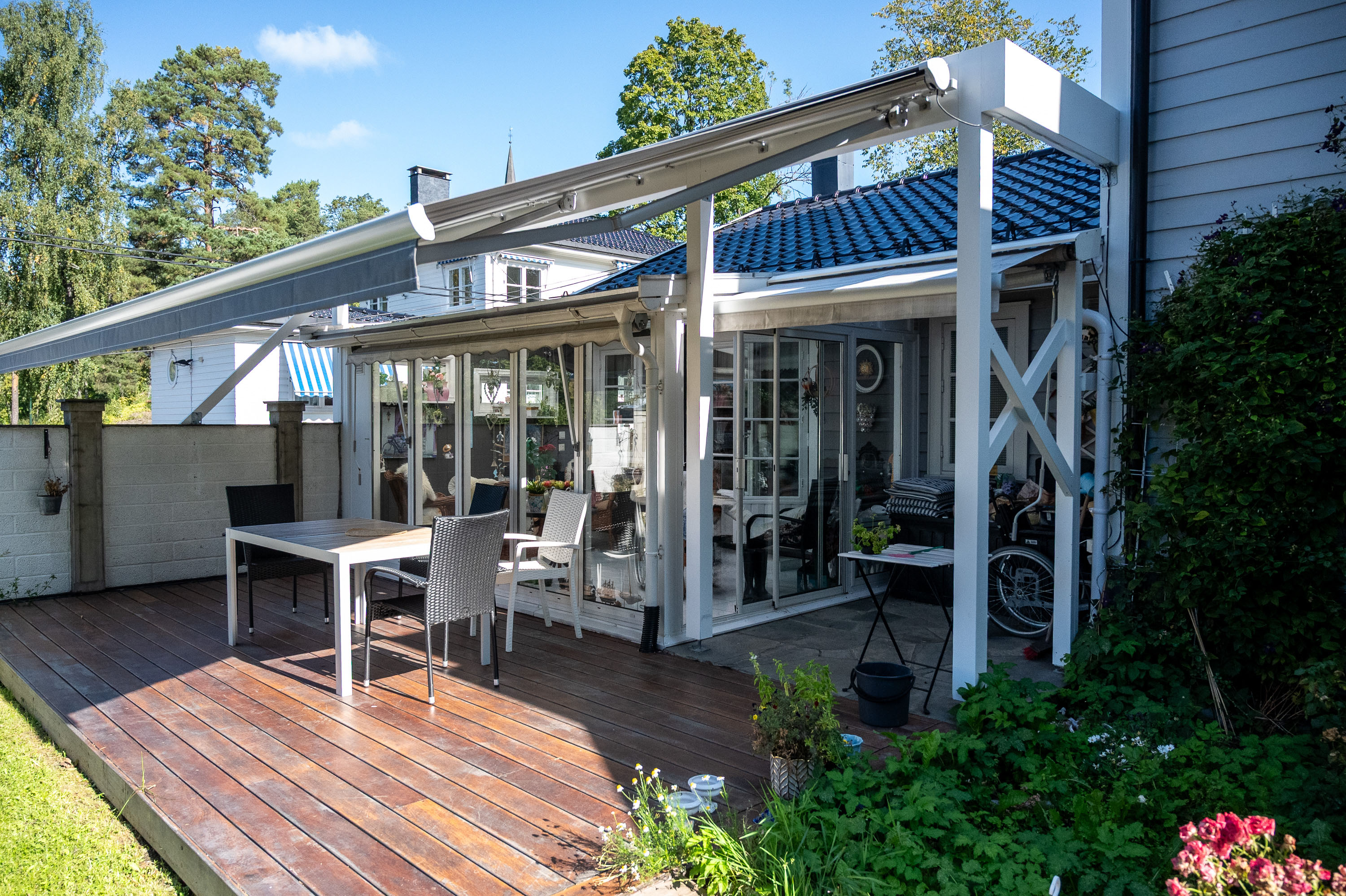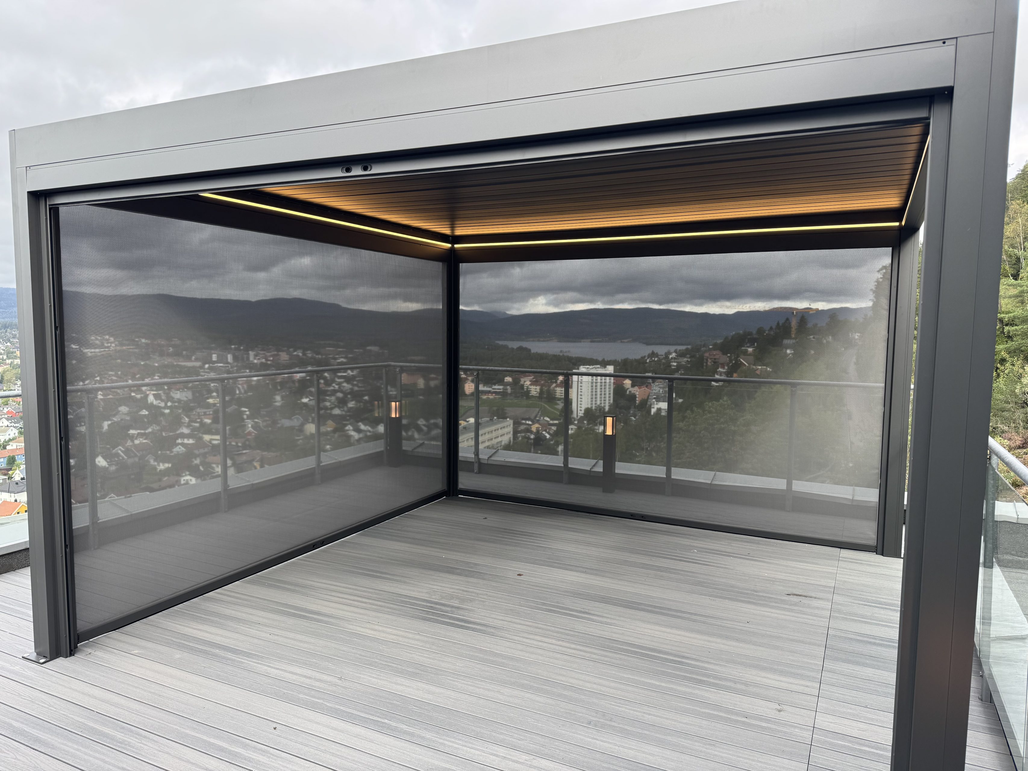 Utvendig solskjerming tar varmen før den treffer glasset. Det gir merkbar forskjell på temperatur og komfort, spesielt på solrike dager.